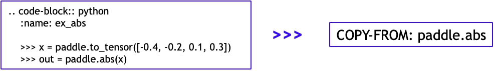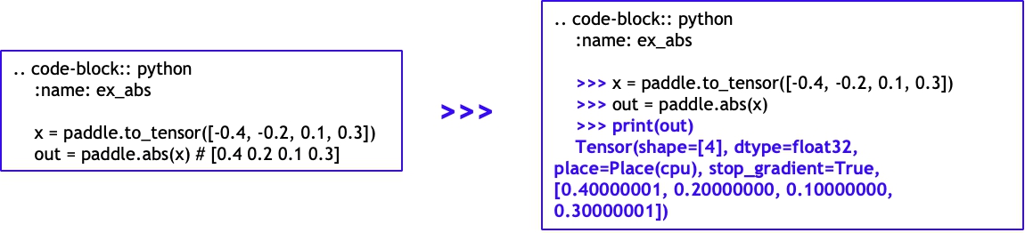但由于历史原因,Paddle 的 API 文档中的示例代码是直接使用 Python 代码块形式编写的,这使得我们无法对示例代码的输出进行自动化检查,从而无法保证展示给用户的示例代码的有效性,导致经常出现用户发现文档中的输出与实际运行结果不一致的情况。